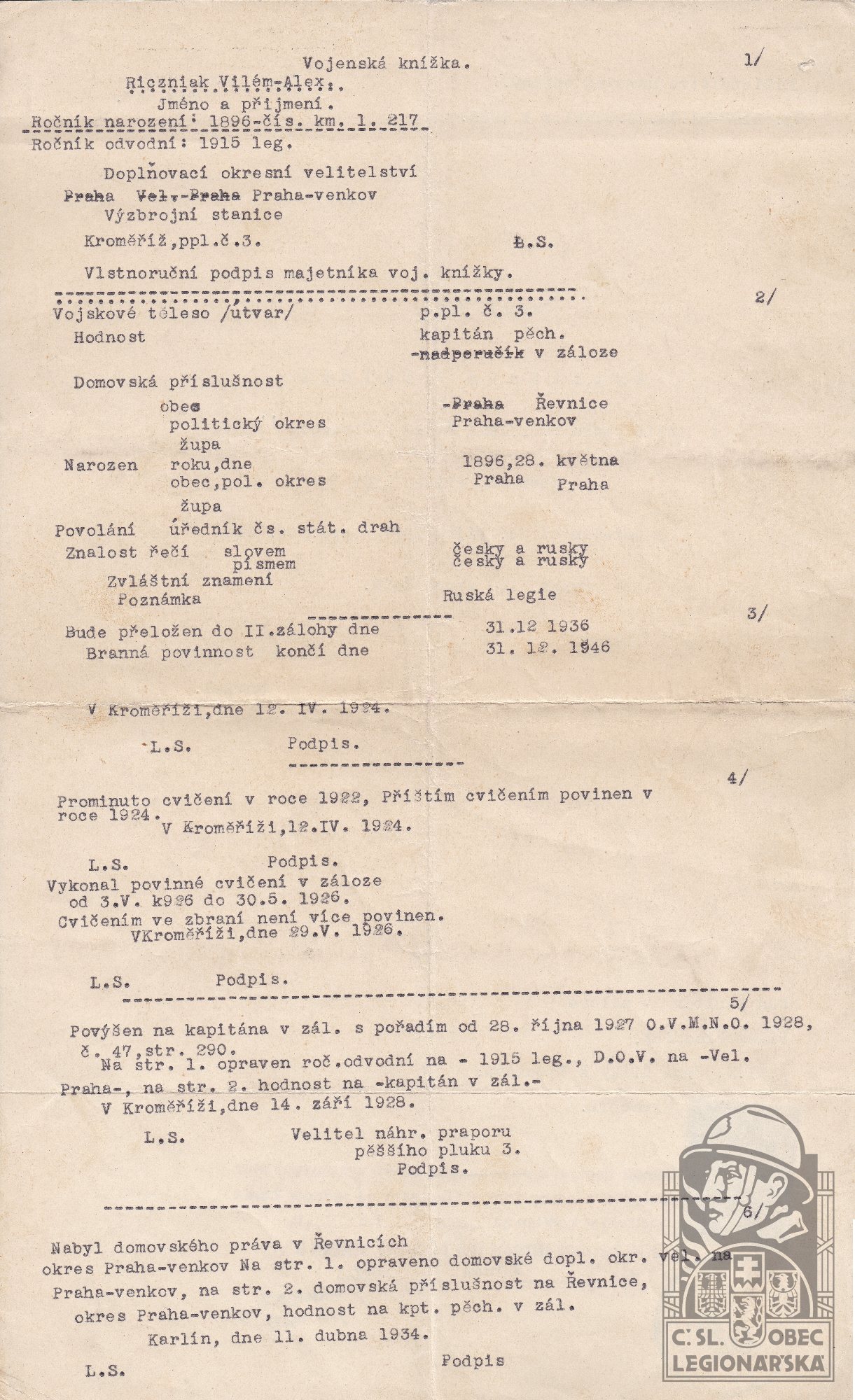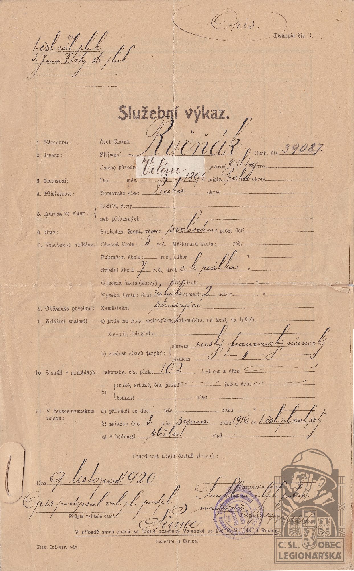 Zdroj informací: legionářský poslužný spis osobní karta legionáře