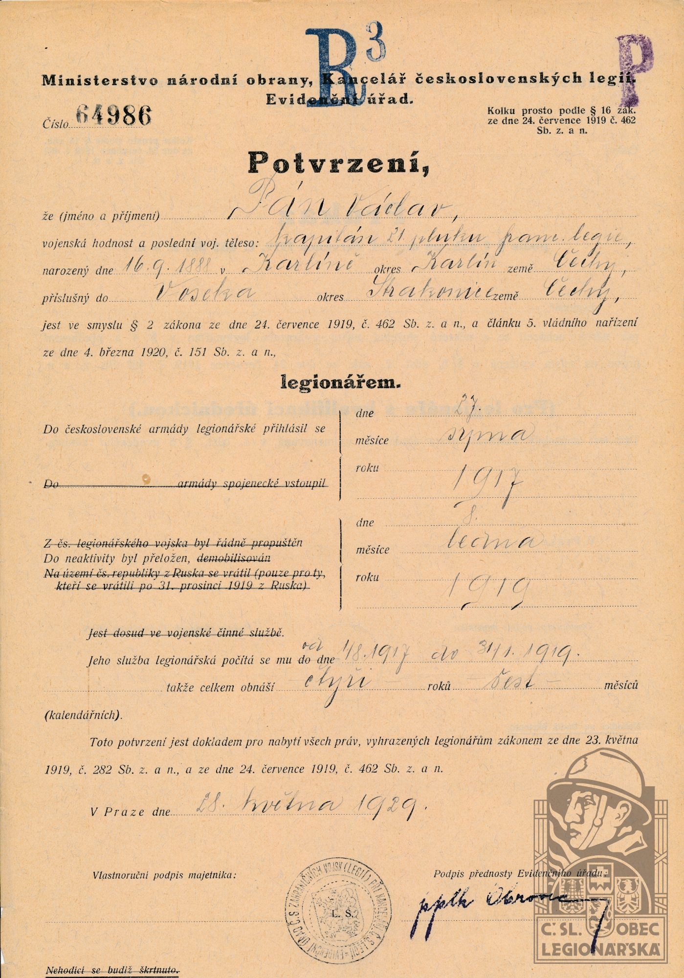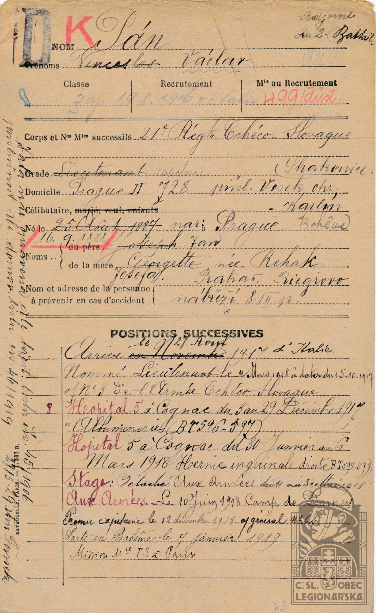 Datum podání přihlášky do legií:27.8.1917