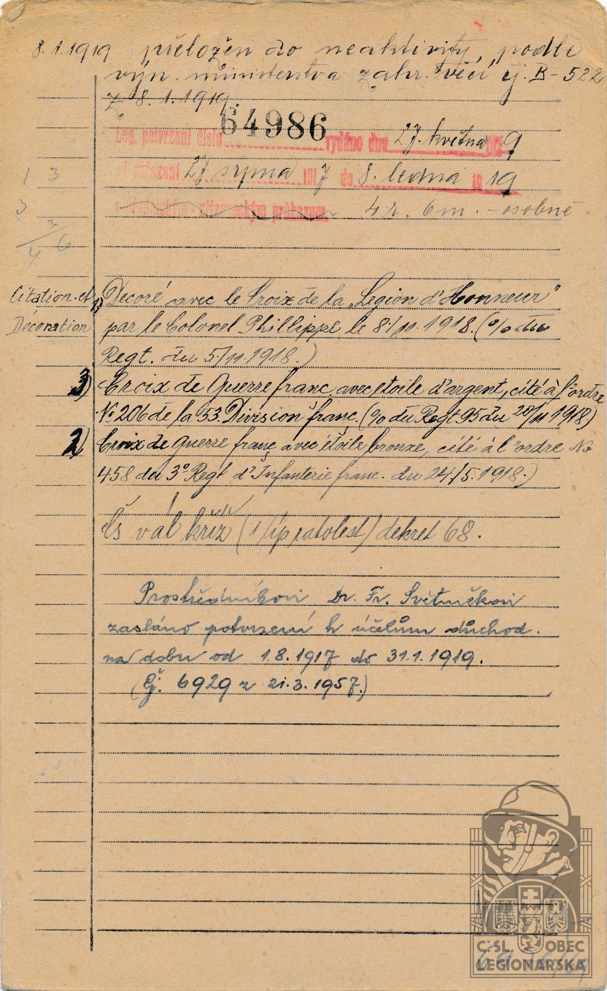 Konec v legiích:8.1.1919 ( Viz poznámku )