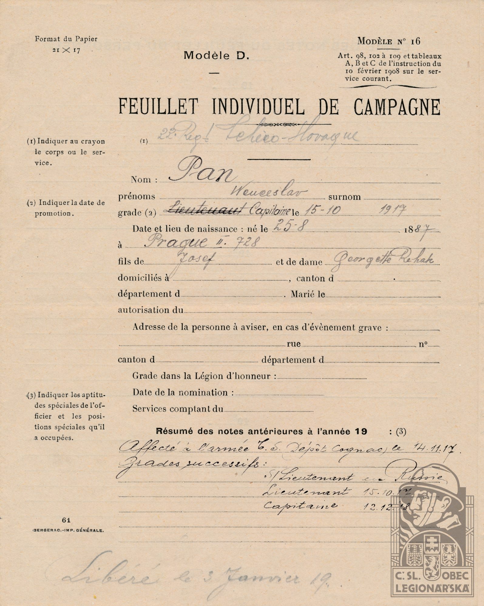 Jednotka v době zařazení:144.p.pl. ( Francouská armáda )