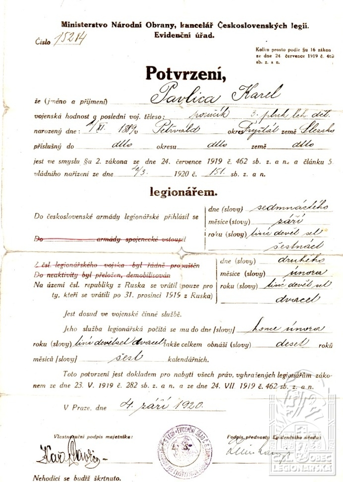 Zdroj informací: legionářský poslužný spis osobní karta legionáře