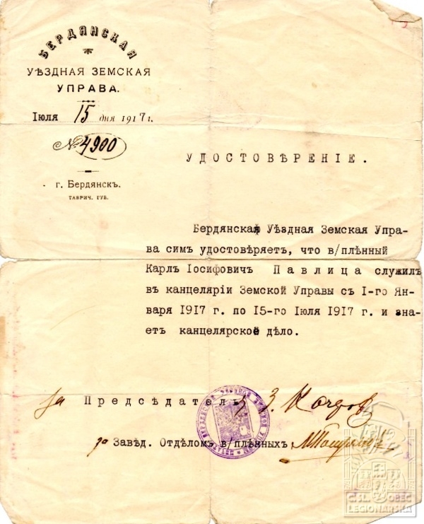 Rakousko-uherský útvar v době zajetí:3.pl.pev.děl.