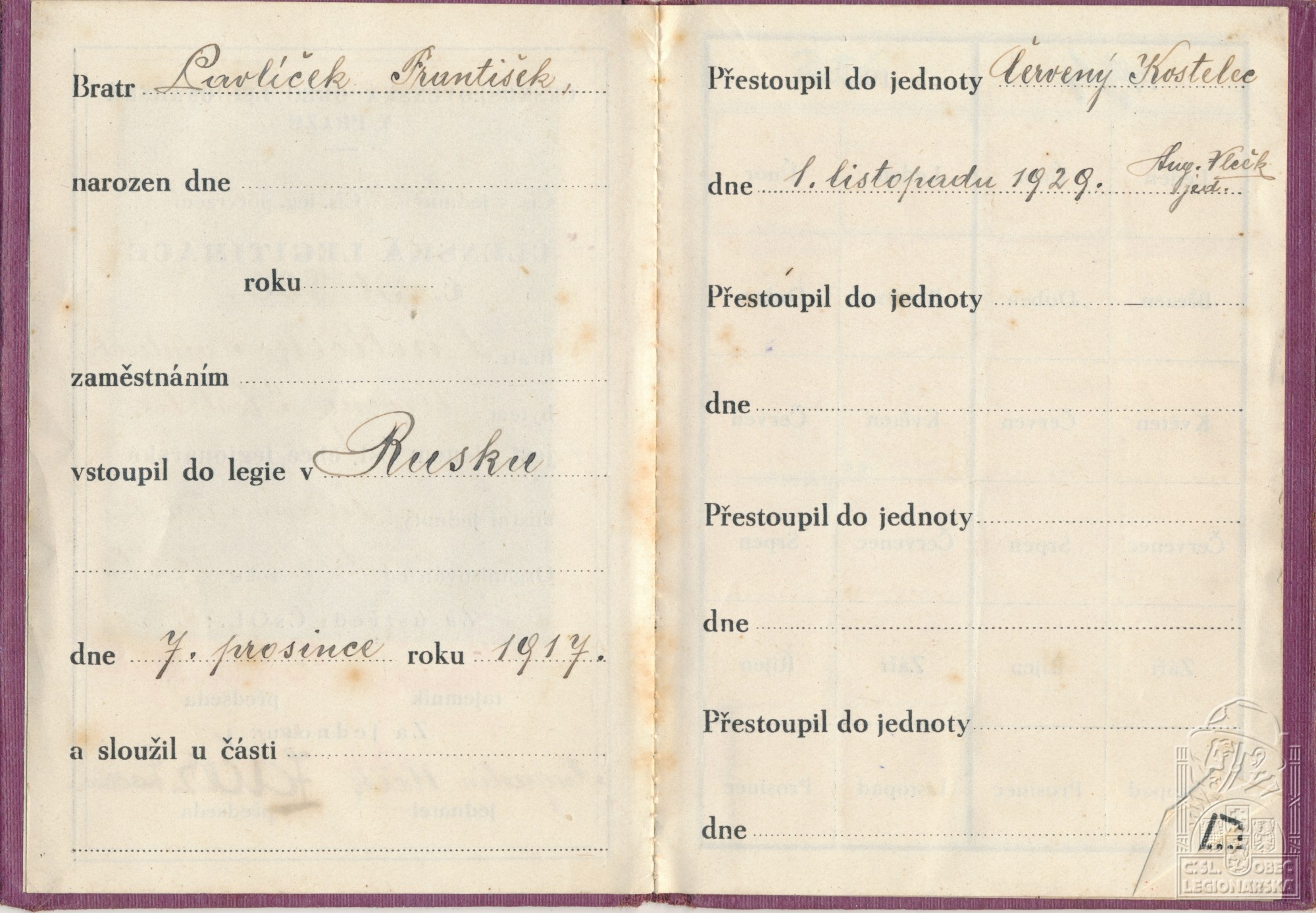 Zdroj informací: legionářský poslužný spis osobní karta legionáře