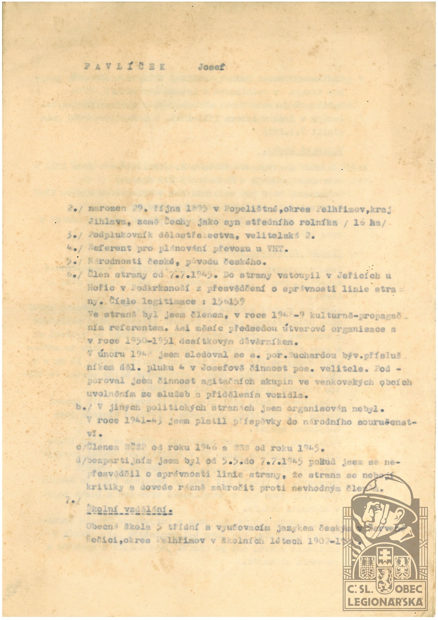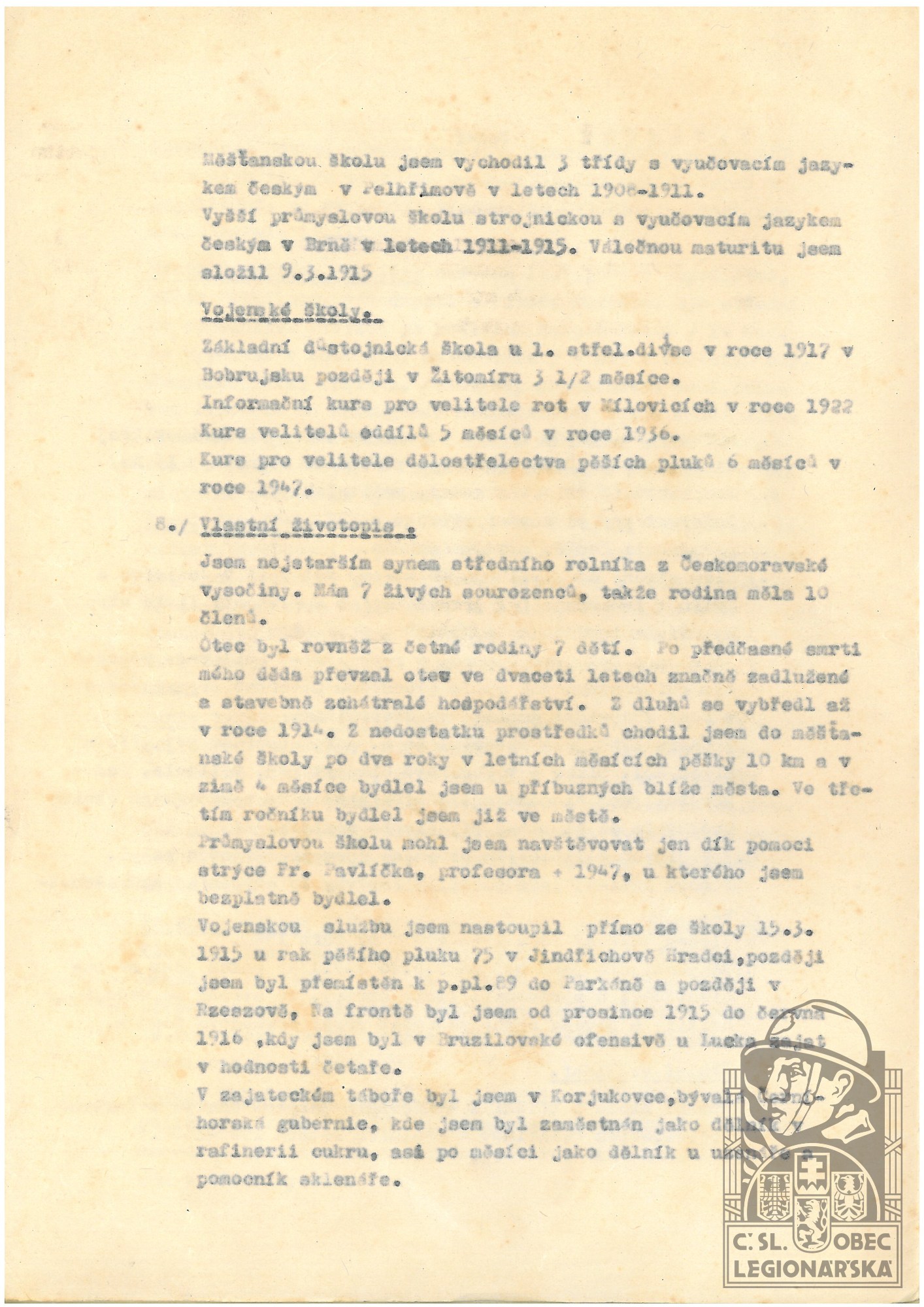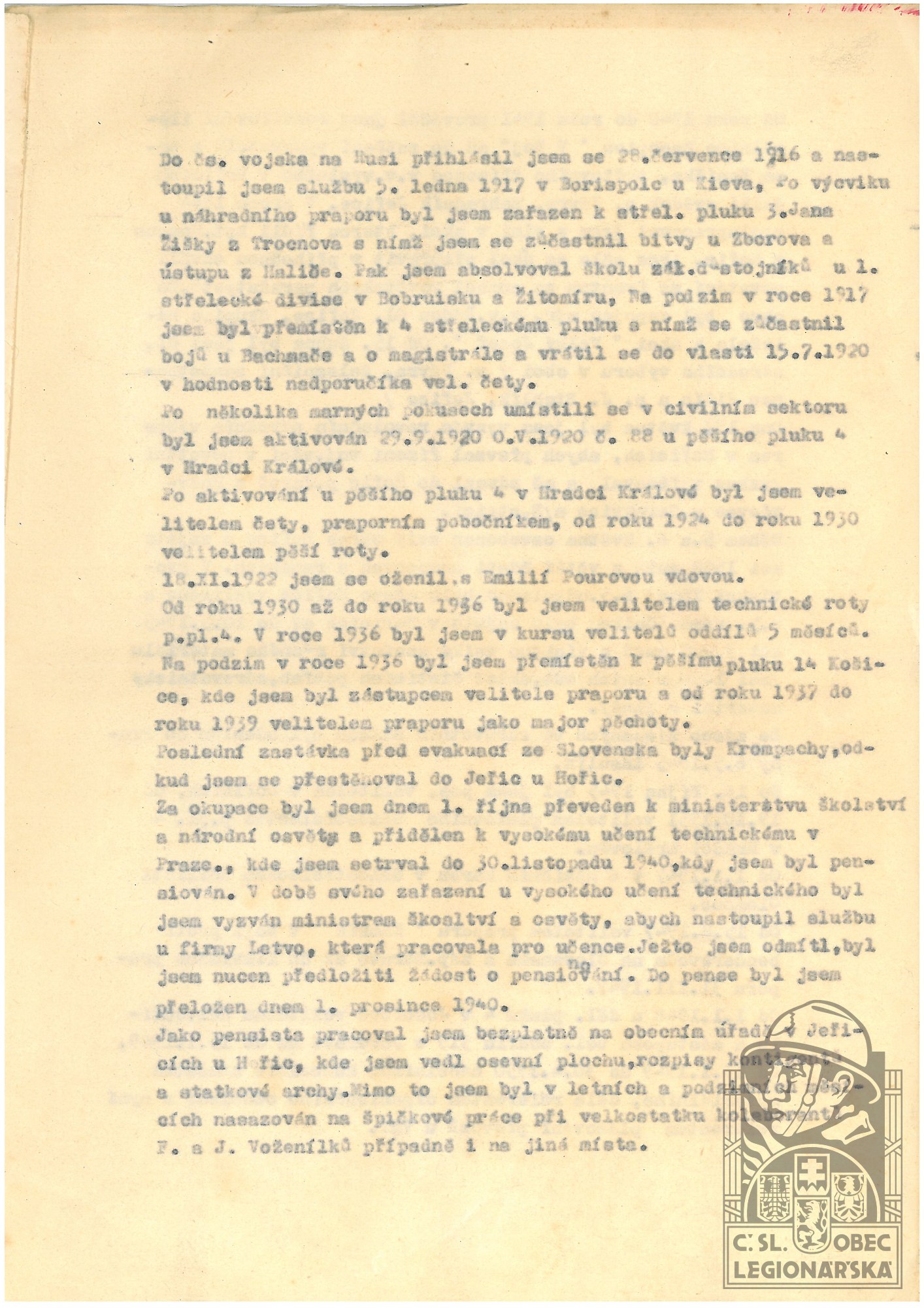 Zdroj informací: legionářský poslužný spis osobní karta legionáře rodinný archiv VUA