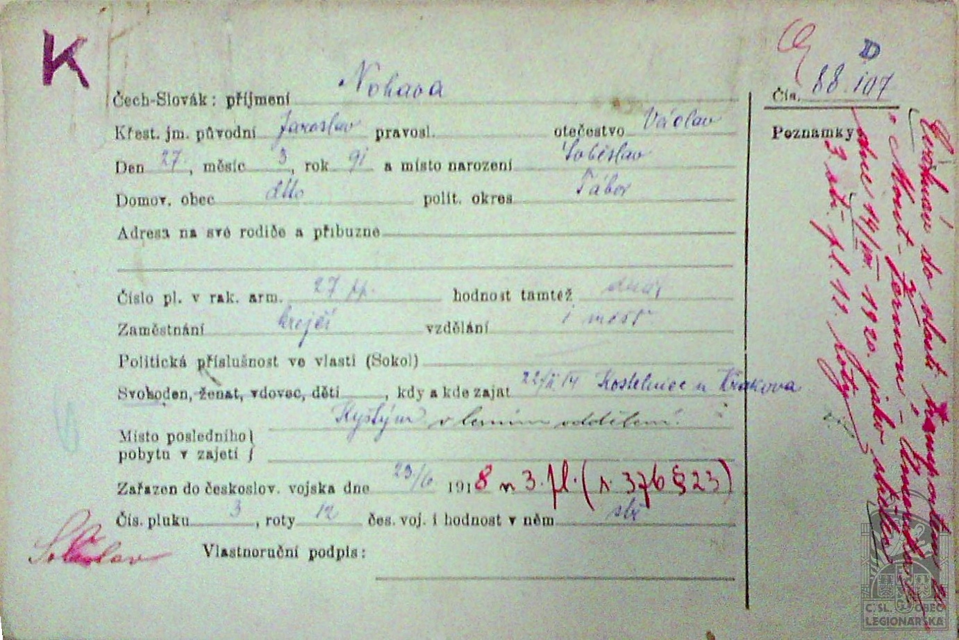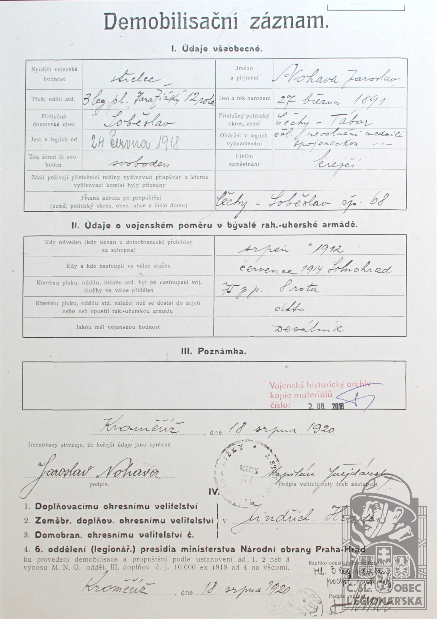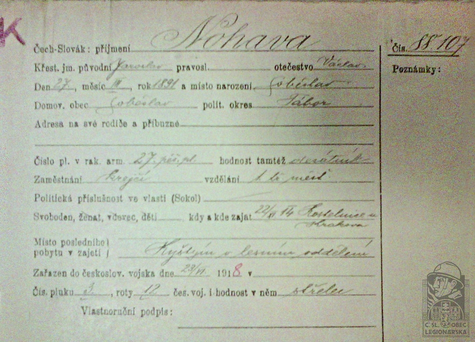 Zdroj informací: legionářský poslužný spis osobní karta legionáře