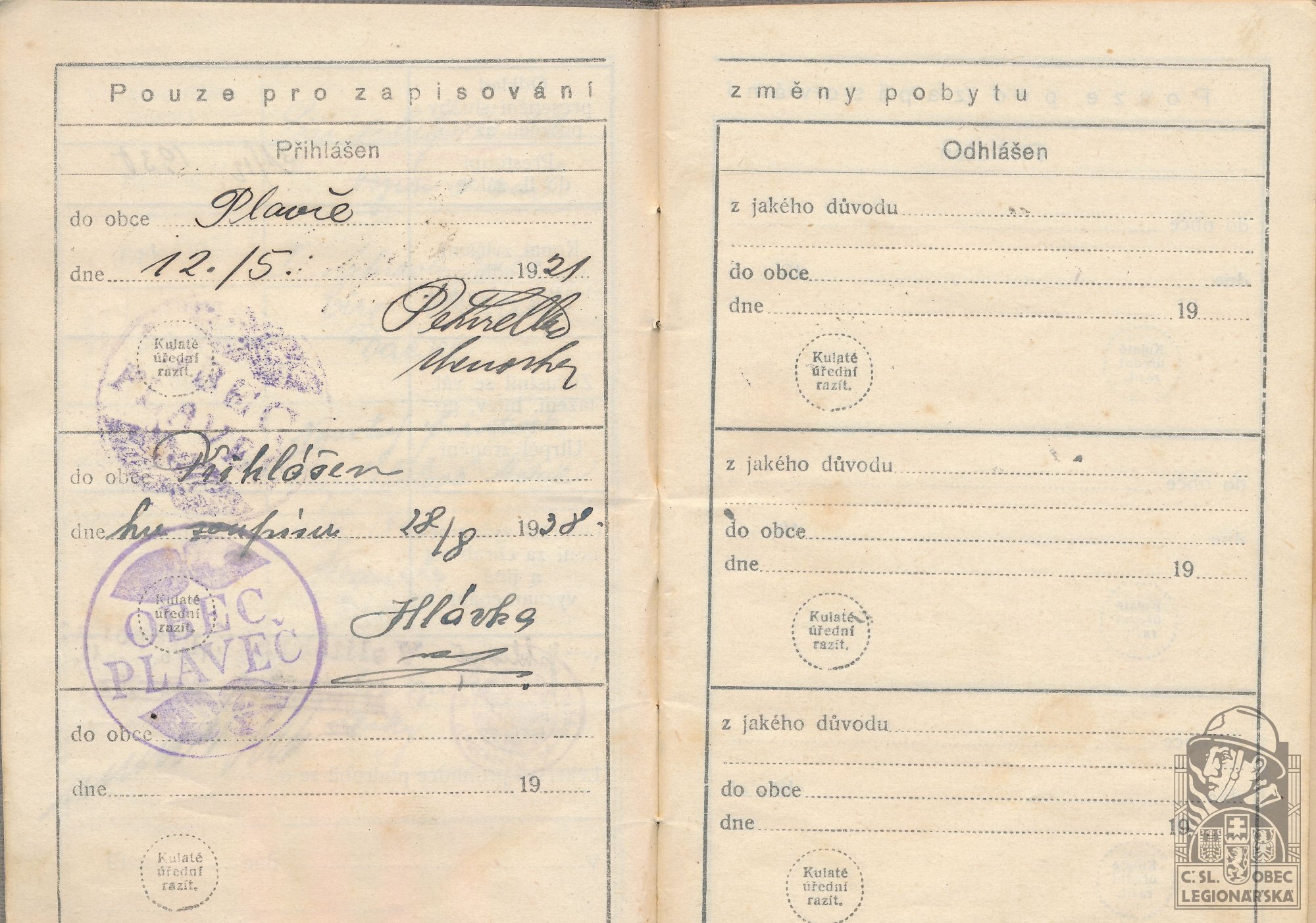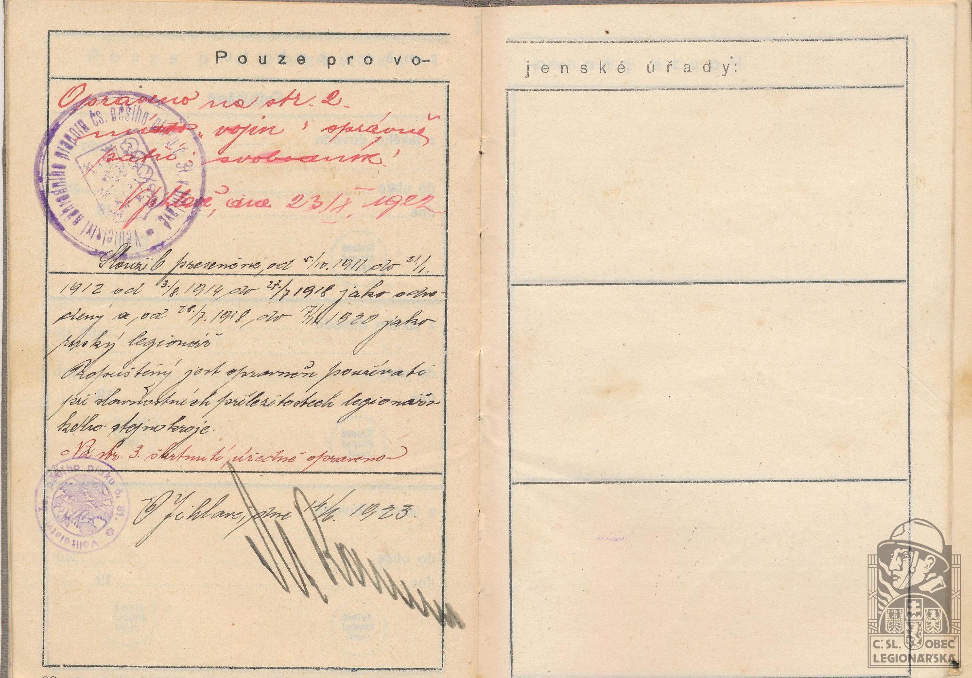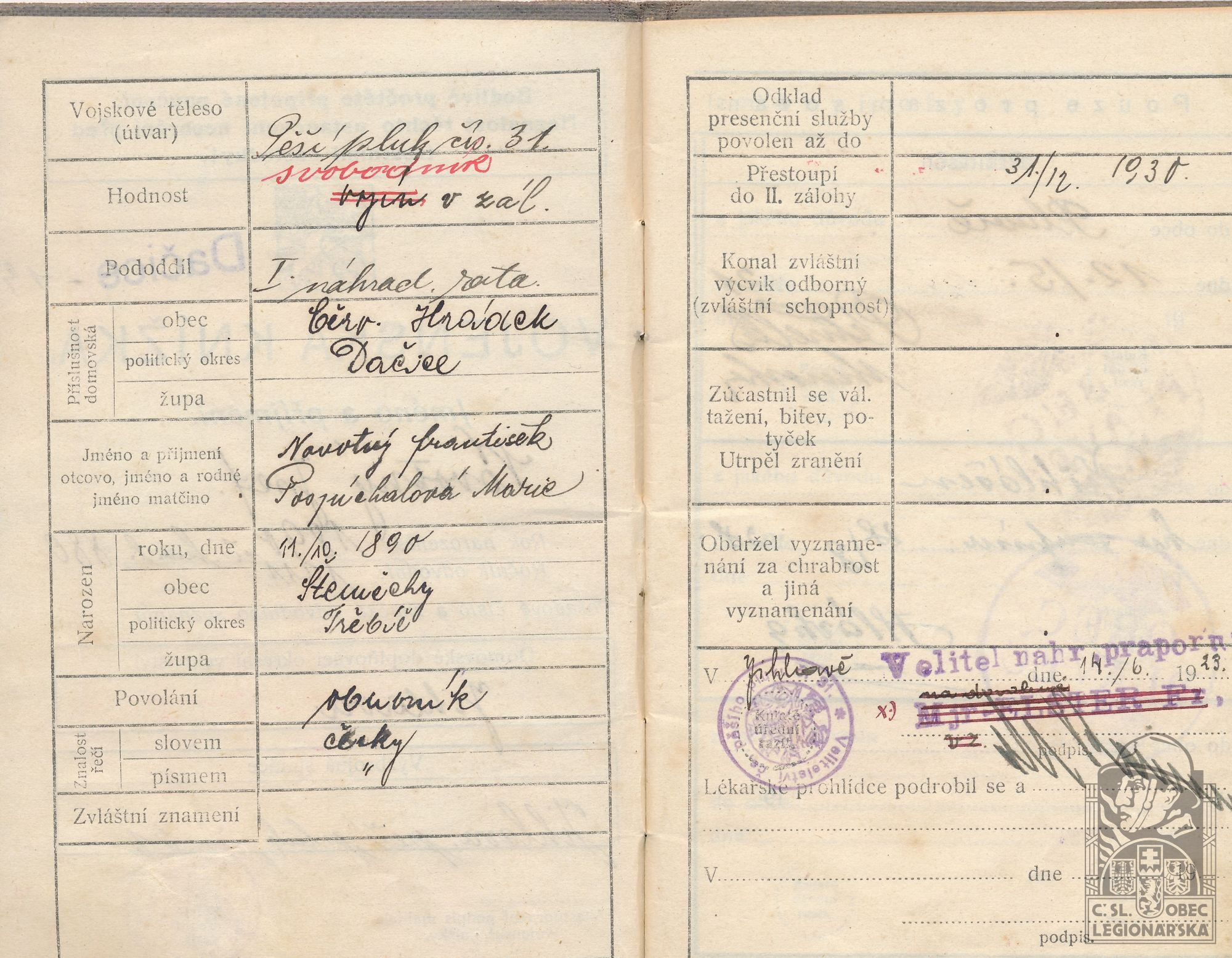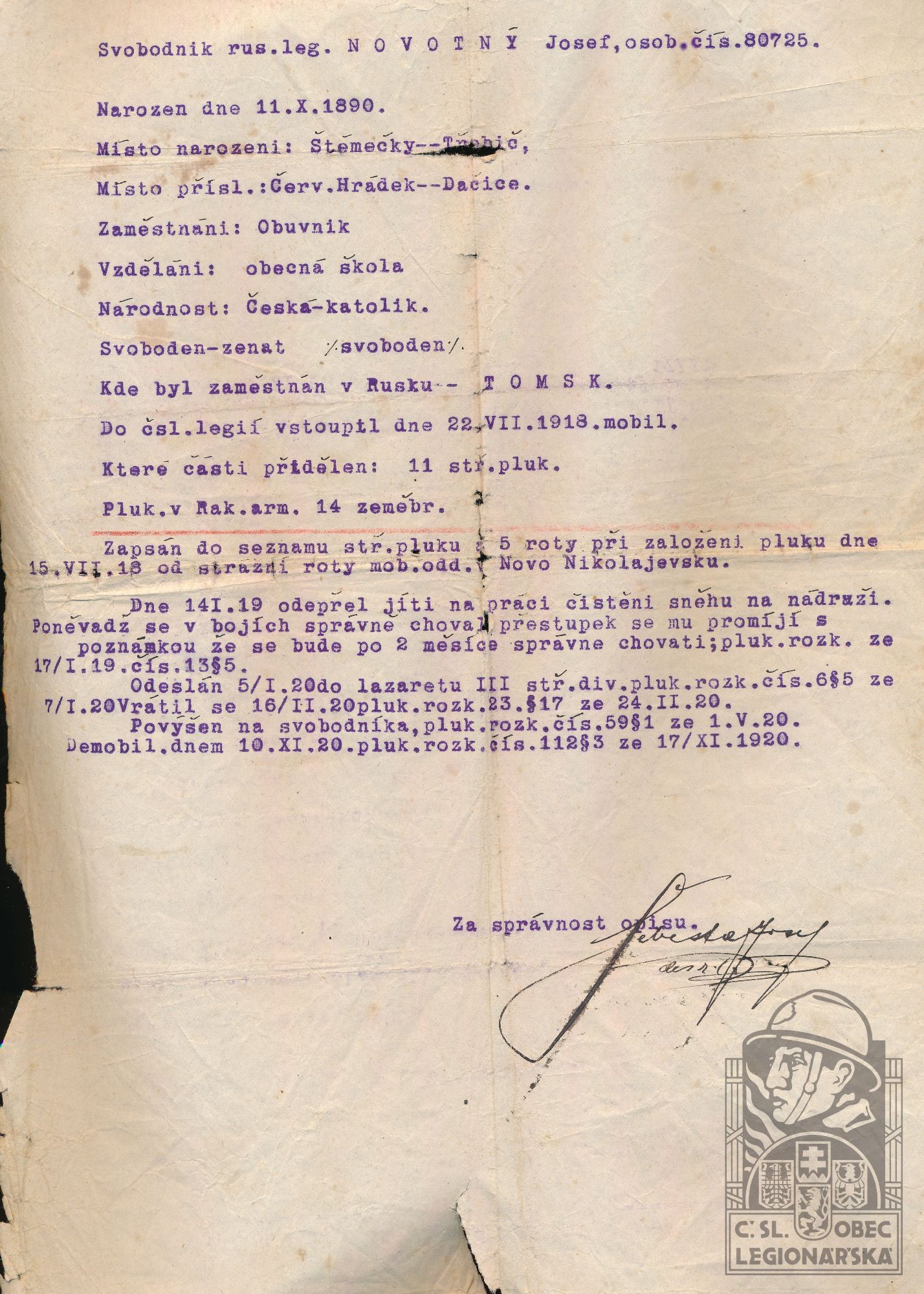 Zdroj informací: legionářský poslužný spis osobní karta legionáře