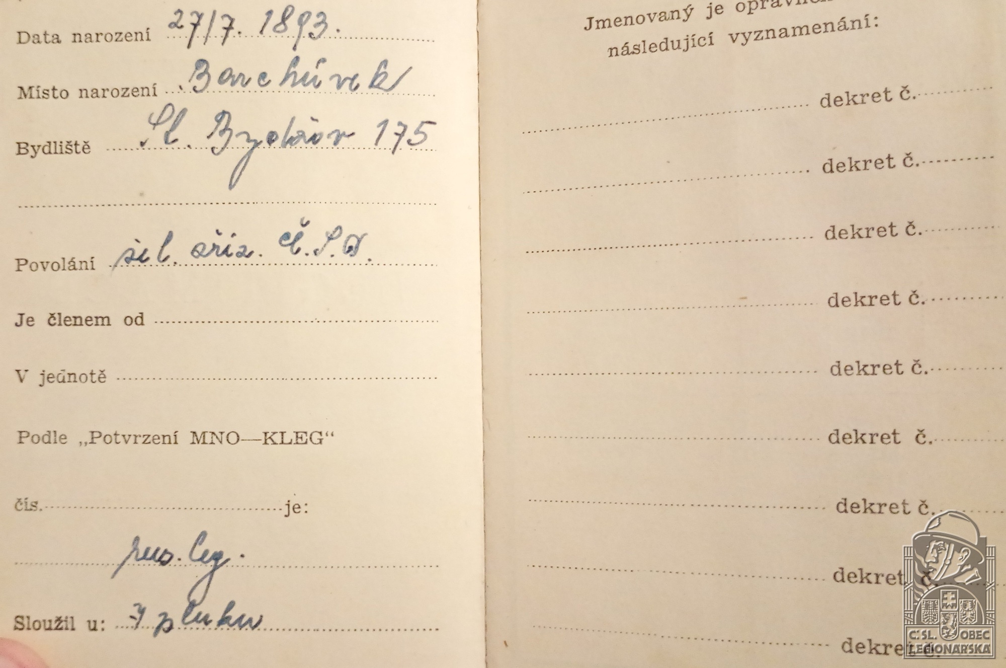 Zdroj informací: legionářský poslužný spis osobní karta legionáře