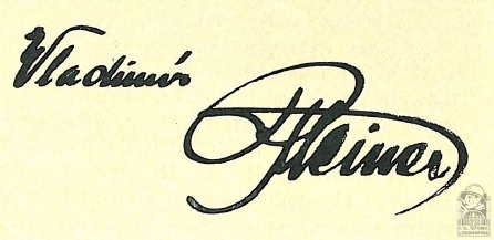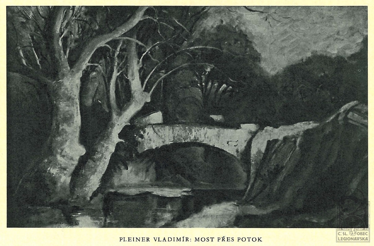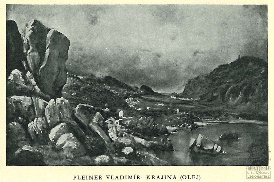 Životopis:Vladimír Pleiner, malíř a legionář, se narodil 28. 7. 1891 v Brantu, osadě, která je součástí Hostokryjí, které jsou částí městyse Senomaty v okrese Rakovník. Domovskou obcí byly Petrovice, které jsou dnes součástí Prahy. Vystudoval reálku a vyšší zahradnickou školu v Lednici na Moravě, kde se projevilo jeho malířské nadání. Pracoval pak jako zahradní architekt, ale zároveň se věnoval malířství. Když vypukla první světové válka, musel také on nastoupit službu v rakousko-uherské armádě a odejít na frontu. Jako důstojnický kadet českobudějovického 91. pěšího pluku rakousko-uherské armády padl 22. 6. 1915 do ruského zajetí u obce Stavčany na zemí dnešní Ukrajiny (tehdejší carské Rusko). Následný čas strávil v ruských zajateckých táborech, než si 25. 7. 1917 v Bujinsku (Buinsk, Tatarstán, Rusko), patrně na základě zpráv o úspěchu československých legionářů v bitvě u Zborova (2. 7. 1917), podal dobrovolnou přihlášku do československého vojska v Rusku, tzv. legií. Zařazen již 16. 8. 1917 do 5. čs. střeleckého pluku „Pražského – T. G. Masaryka“ jako mladší důstojník 6. roty. Od 15. 12. 1917 byl zapsán do seznamu 2. čs. záložního pluku. V březnu 1918 byl ustanoven zástupcem plukovního pokladníka a v červenci téhož roku pokladníkem IV. praporu. Od 23. 8. 1918 byl velitelem stanice Inokenťjevskaja na Transsibiřské magistrále. Od prosince 1918 byl přiřazen ke štábu sboru a povýšen na podporučíka. Od února 1919 uveden v seznamu dopravního oddělení a určen za velitele stanice Kljukvená a od července 1919 stanice Nižněudinsk. Zde se 8. 1. 1920 oženil s Ruskou Eliškou Jelesavelou Alexandrovnou, narozenou roku 1897 v Irkutsku. Dne 10. 2. 1920 byl jmenován velitelem stanice Vladivostok-Egeršeld. Z Ruska se pak domů vracel v hodnosti poručíka dopravní roty Československého velitelství Dálného Východu lodním transportem s pořadovým číslem 21 na palubě lodi Titan. Společně s ním se plavila jeho ruská manželka.