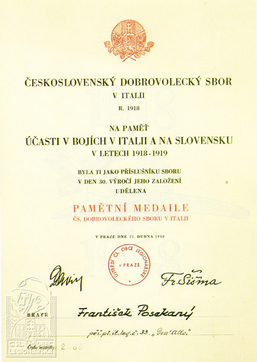 Jednotka v době zařazení:33.p.pl. ( Čs. legie v Itálii )