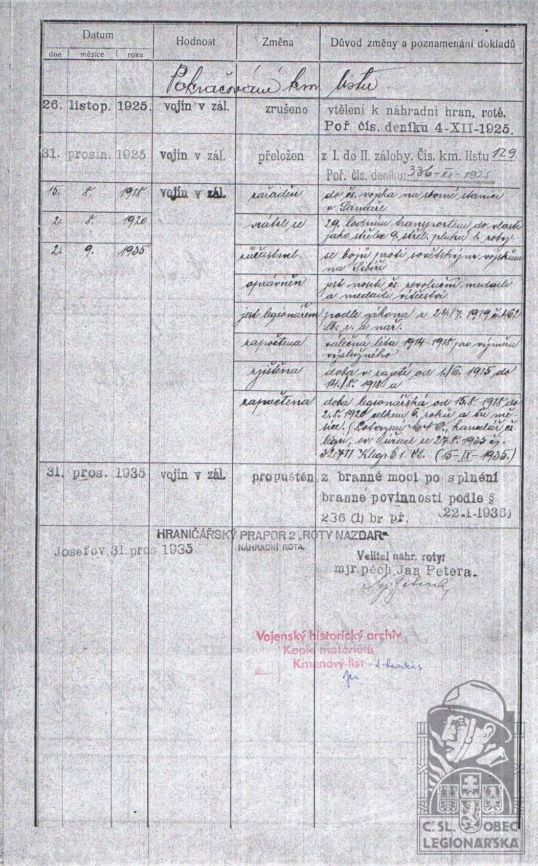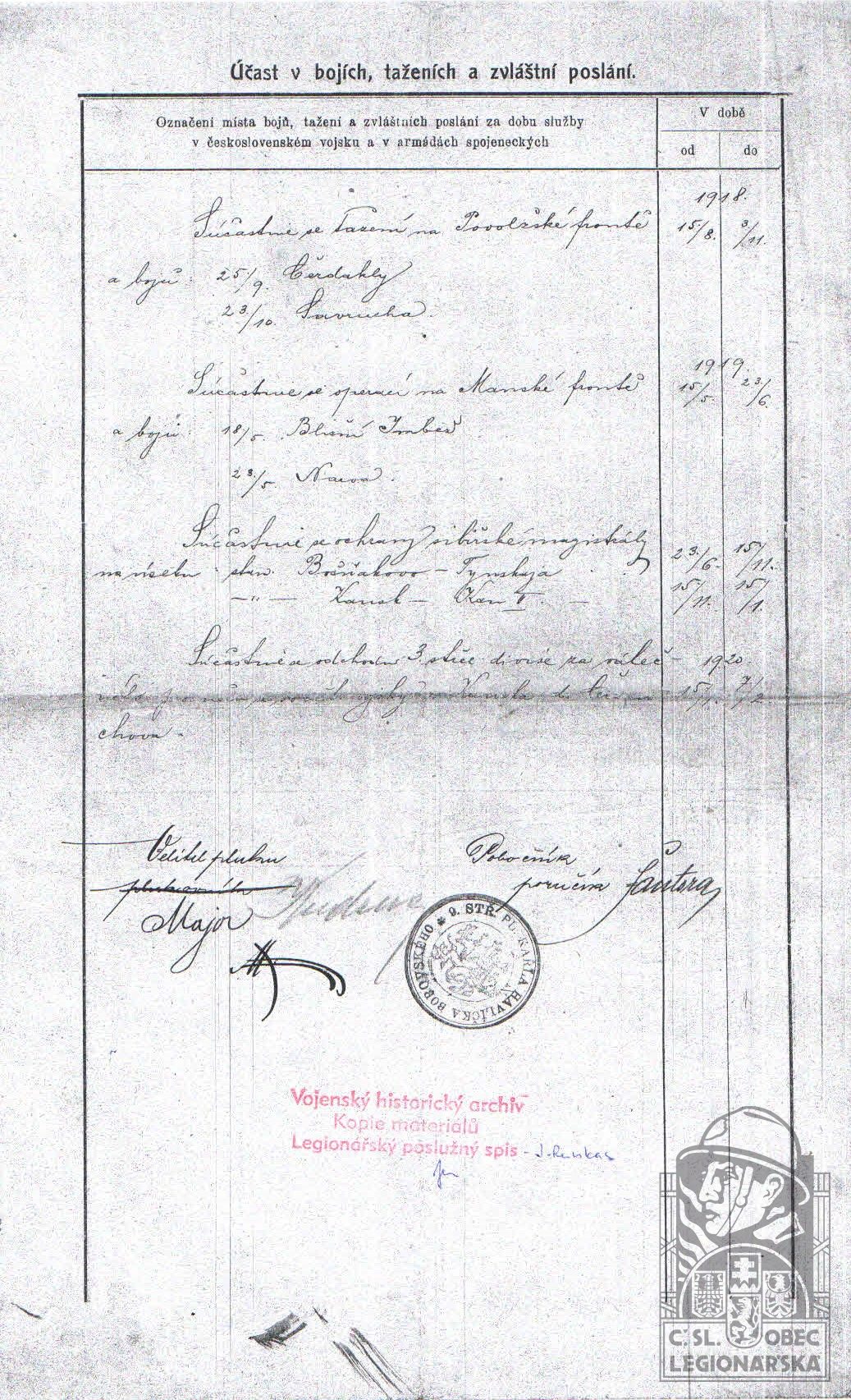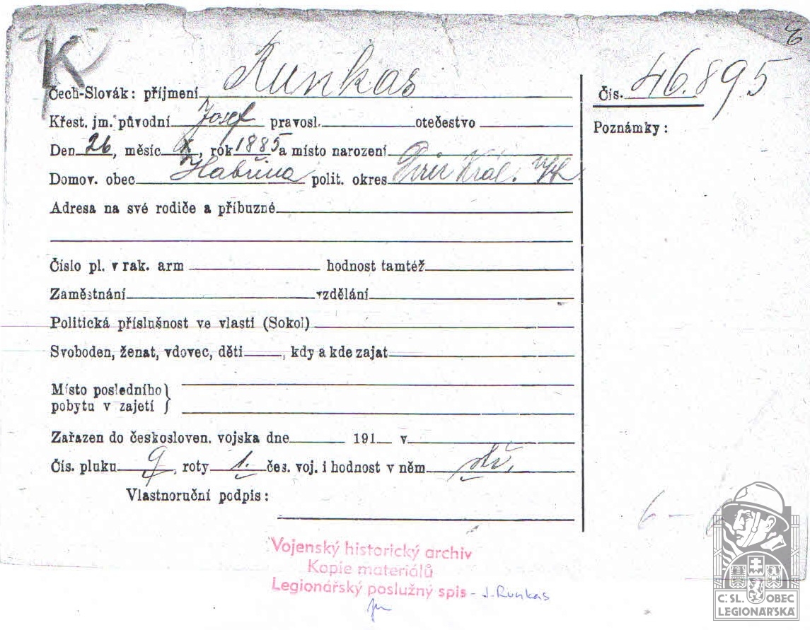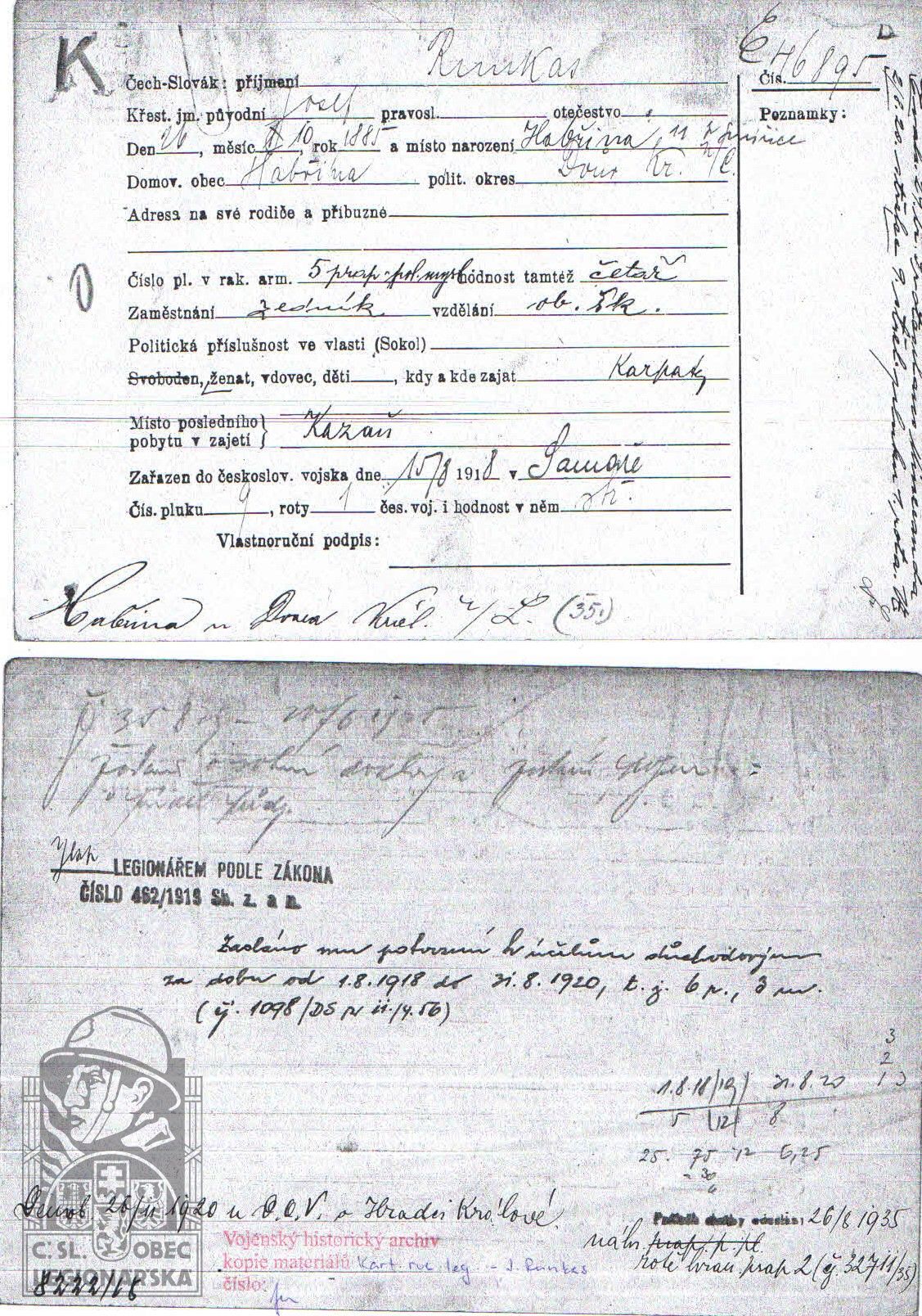 Zdroj informací: legionářský poslužný spis osobní karta legionáře