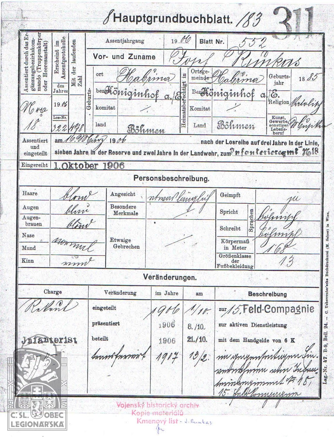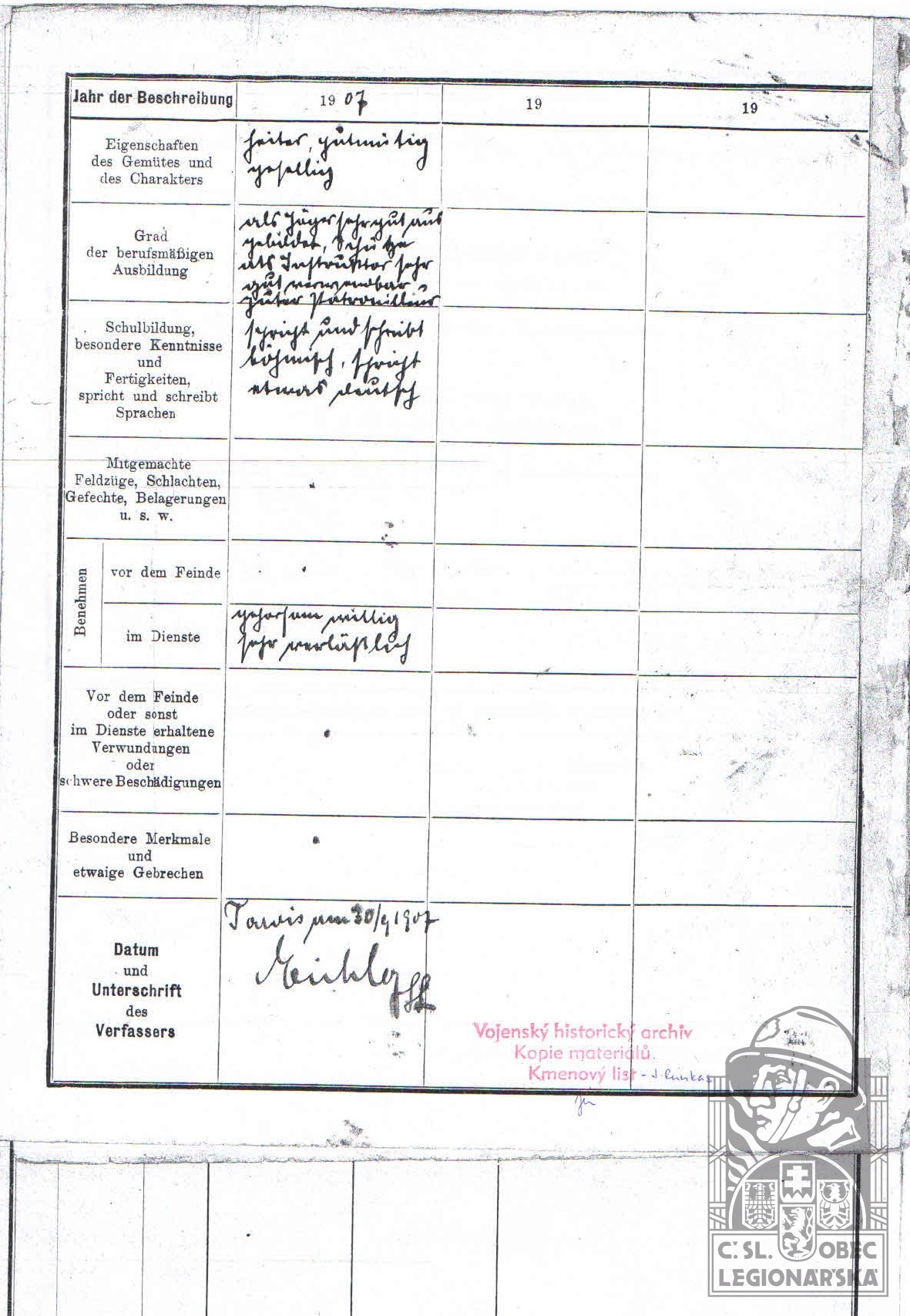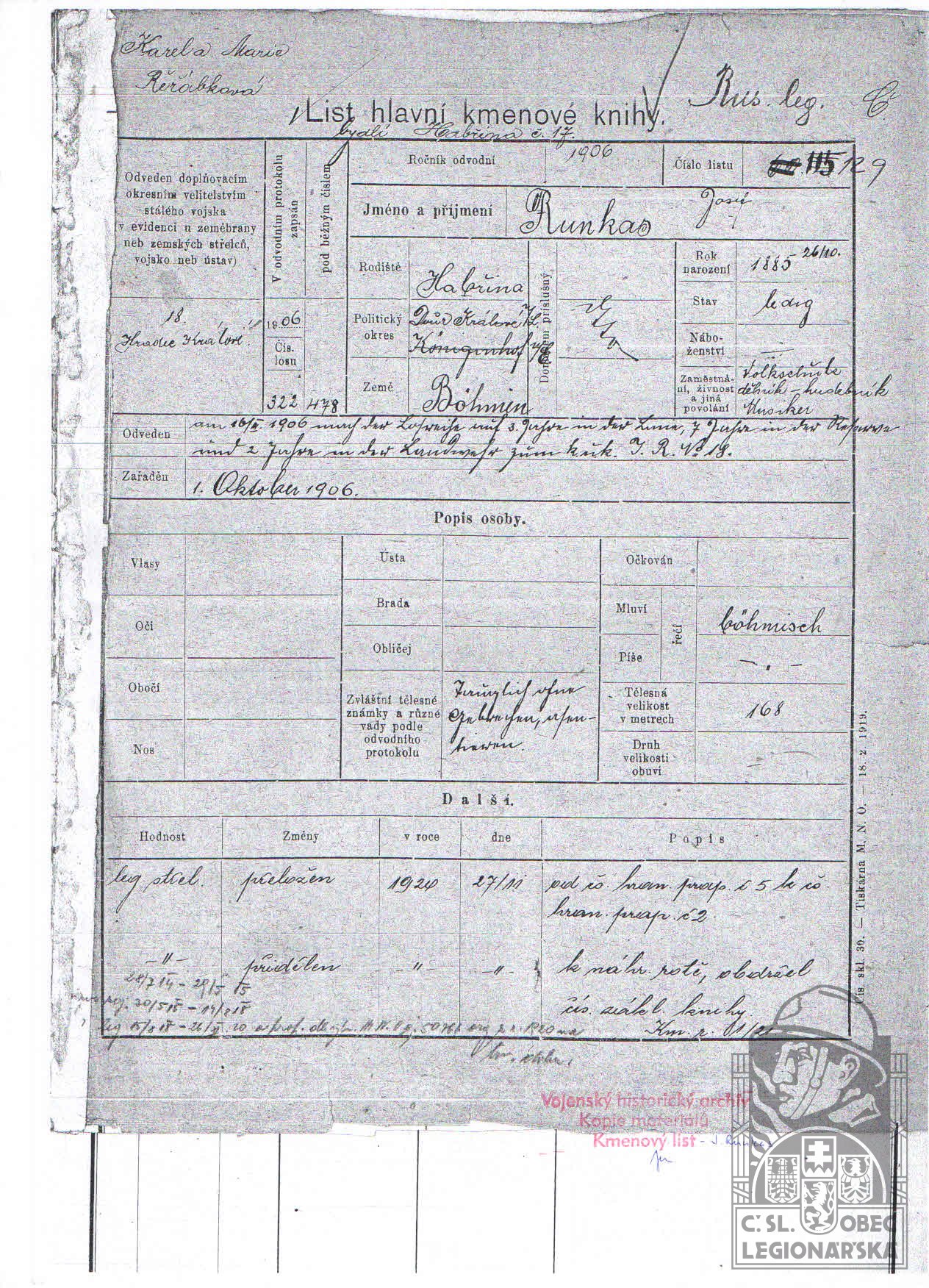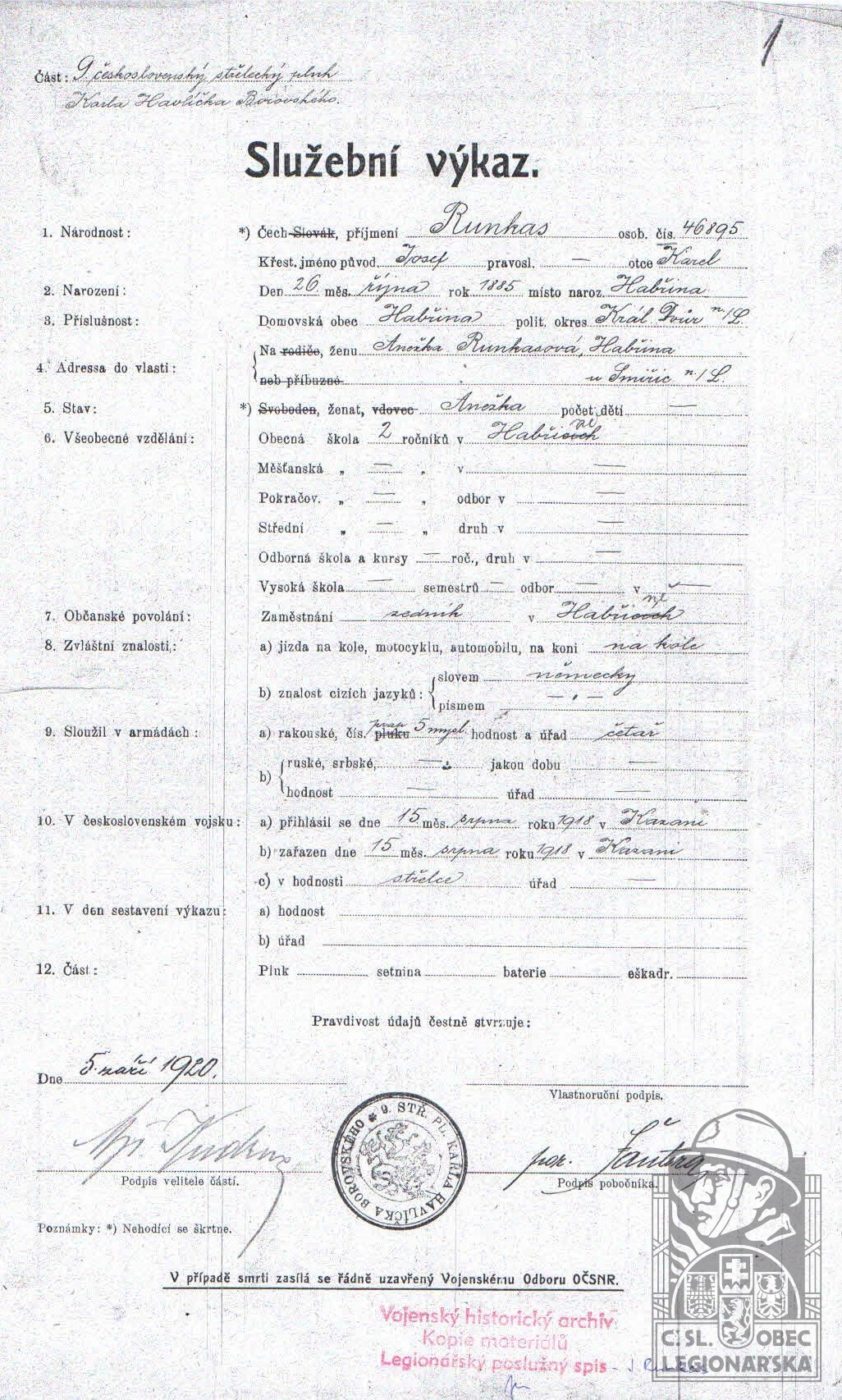 Zdroj informací: legionářský poslužný spis osobní karta legionáře