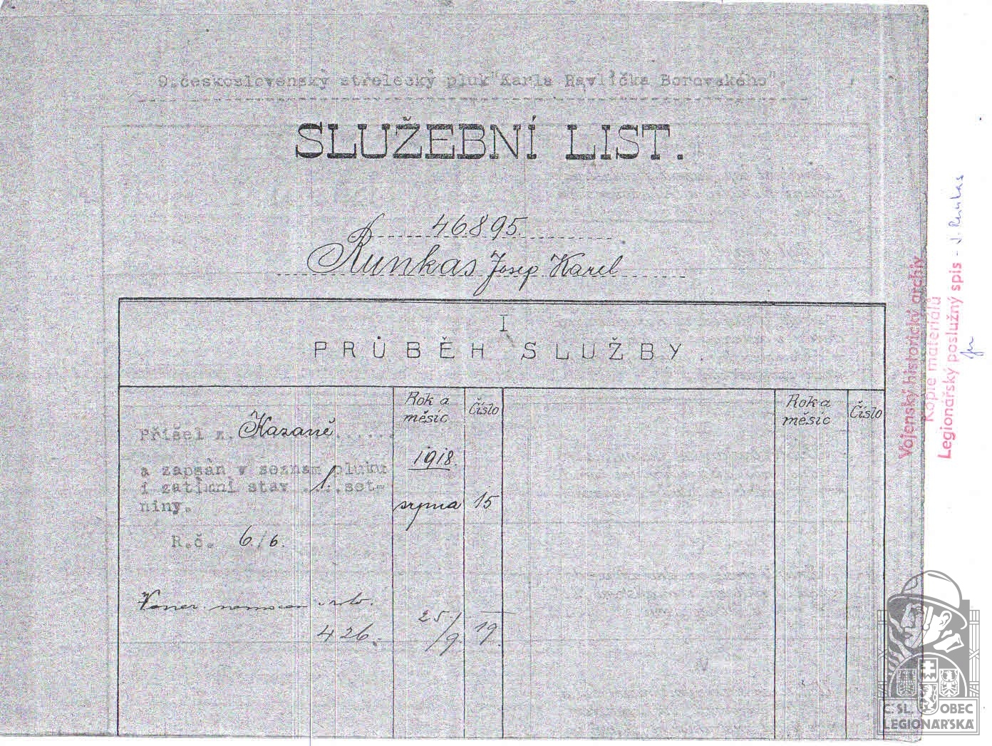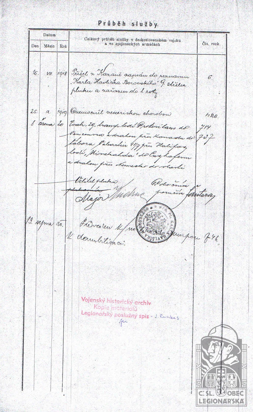 Datum zařazení do legií:15.8.1918