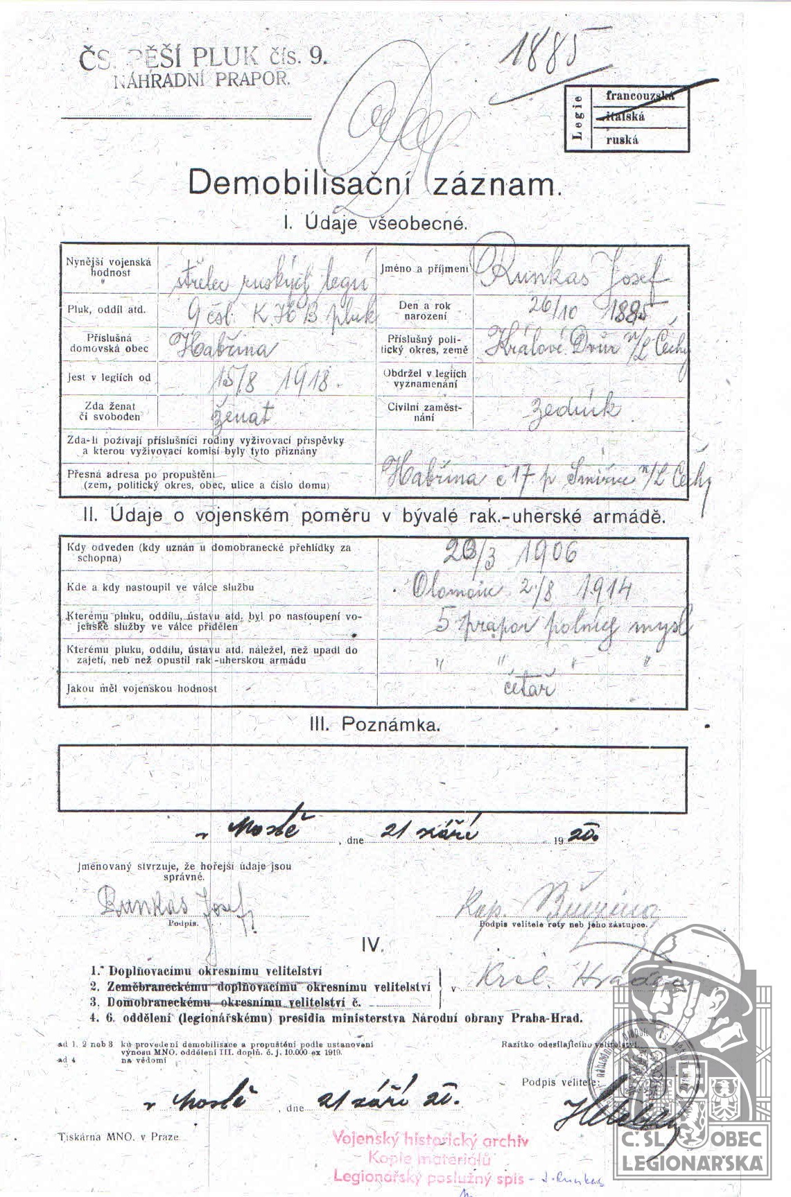 Konec v legiích:26.11.1920 ( Demobilizován )