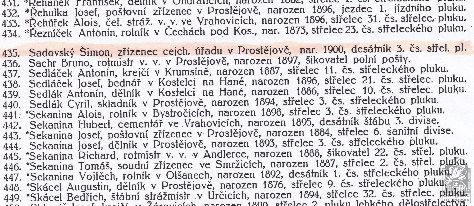 Zdroj informací: legionářský poslužný spis osobní karta legionáře