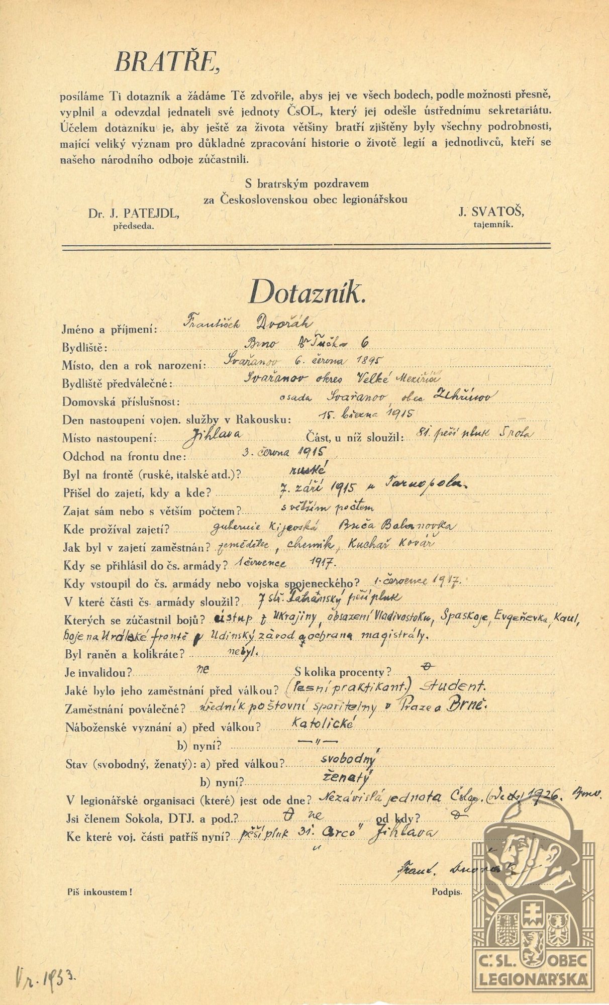Zdroj informací: legionářský poslužný spis osobní karta legionáře Muzeum Velké Meziříčí, fond A9/1