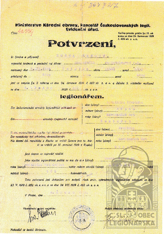 Zdroj informací: legionářský poslužný spis osobní karta legionáře