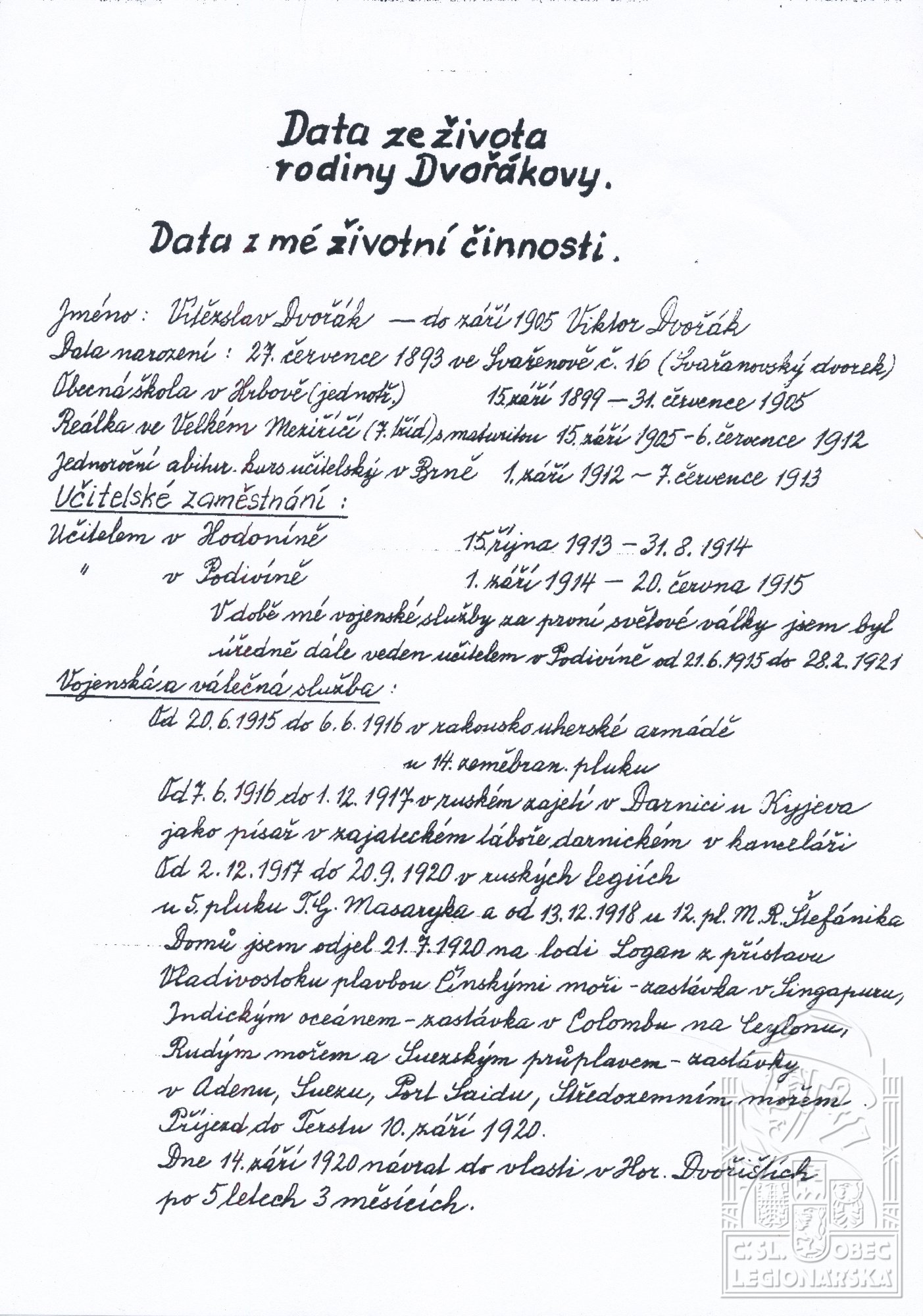 Zdroj informací: legionářský poslužný spis osobní karta legionáře