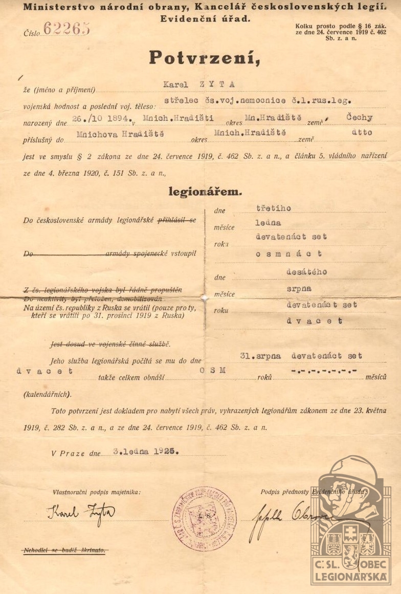 Konec v legiích:10.8.1920 ( Vrátil se do vlasti )