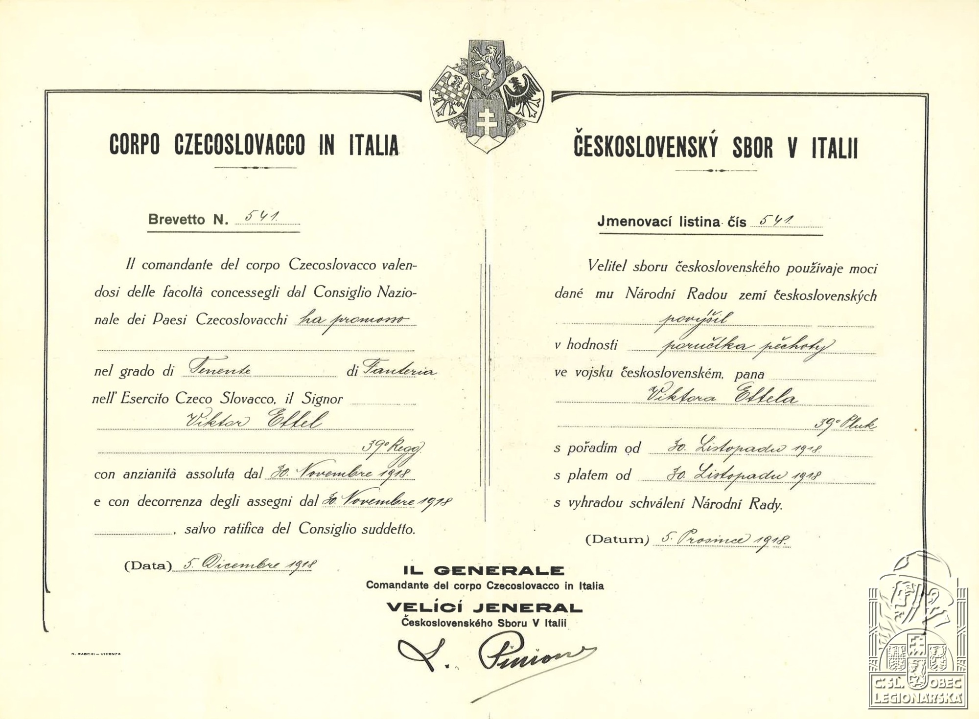 Jednotka v době zařazení:39.p.pl. ( Čs. legie v Itálii )