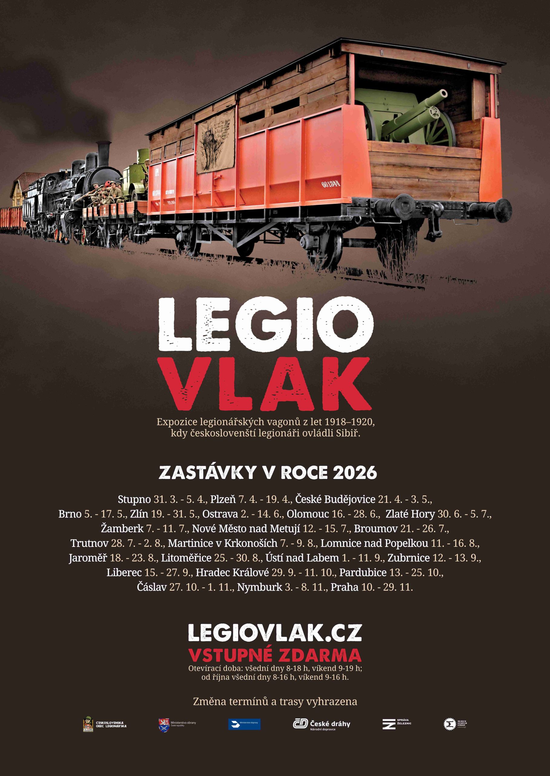 Legiovlak je ambiciózní projekt Československé obce legionářské, který si předsevzal vytvořit věrnou repliku legionářského vlaku z období let 1918-1920, kdy na Transsibiřské magistrále v Rusku probíhaly válečné operace čs. legií. Vlak křižuje od května 2015 celou Českou republiku a jeho cesta potrvá minimálně do roku 2026 díky podpoře Ministerstva obrany a Ministerstva dopravy. Bližší informace o jednotlivých místech, kde můžete Legiovlaku navštívit, naleznete po rozkliknutí příslušného odkazu v sekci zastávky v tomto roce.
