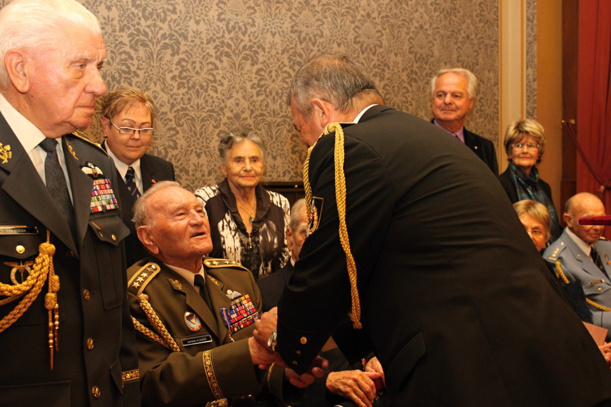 O přestávce se vzácní hosté přesunuli do prezidentského salonku, aby byli přítomni vyznamenávání válečných veteránů. Náčelník GŠ AČR genpor. Josef Bečvář vyznamenal Čestným odznakem AČR za zásluhy III. stupně za bojovou činnost a významný podíl při obraně svobody a demokracie za druhé světové války plk. v. v. Pavla Vranského, npor. v. v. Boženu Ivanovou, npor. v. v. Vladimíra Wintera a svob. v. v. Viktora Wellemina. Náčelník GŠ OS SR genpor. Milan Maxim následně předal Pamětní medaili náčelníka GŠ OS SR I. stupně za aktivní bojovou činnost za druhé světové války a účast v bojích při osvobození Československa genpor. Jaroslavu Klemešovi, brig. gen. Emilu Bočkovi a brig. gen. Miloslavu Masopustovi. Genpor. Alexandru Beerovi, který ze zdravotních důvodů nemohl být přítomen, bude vyznamenání předáno později osobně. Po gratulacích následoval slavnostní přípitek prezidenta republiky, po kterém se přítomní přesunuli zpět do Dvořákovy síně na druhou část koncertu.