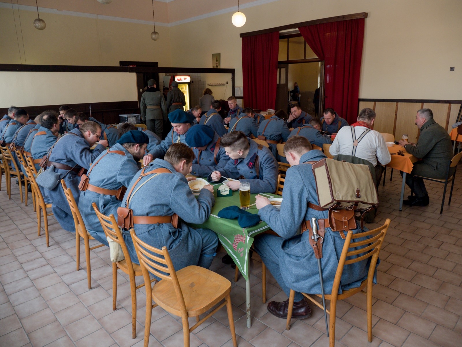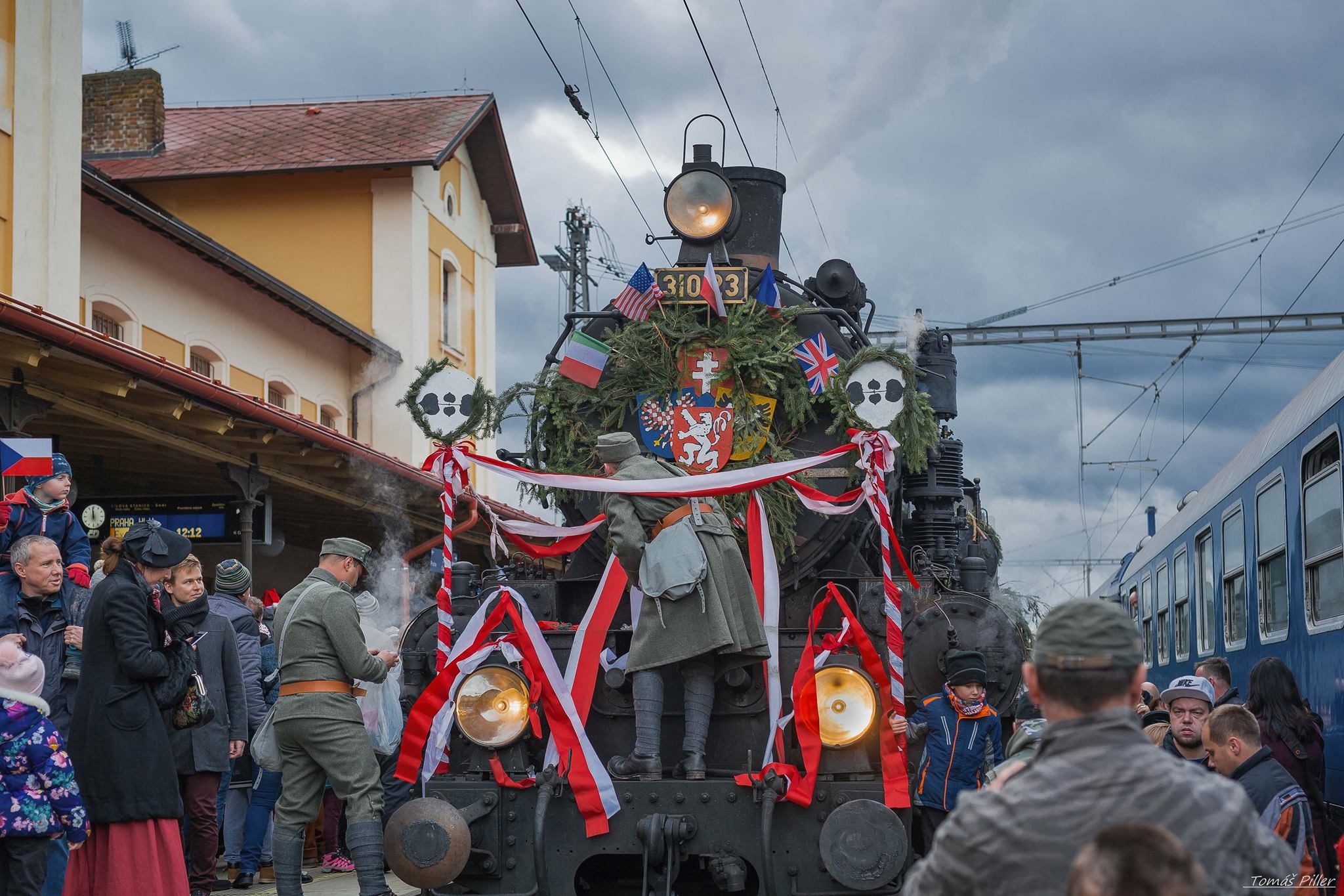 Do cílové a zanedlouho vlastně i první stanice naší cesty na Prahu jsme dorazili něco po deváté. Svítilo sluníčko, nebe bylo jako šmolka a peron byl zcela vymetený. Tedy až na formující se vojenské oddíly. V bývalé nádražní hospodě bylo pro účinkující vytvořeno zázemí. A tady jsme strávili nekonečných pět hodin. Čekali jsme na vlak, kterým přijede zbytek souboru, popíjeli punč, ať už s alkoholem nebo bez něj, ochutnali gulášovou polévku, učili se texty, chodili na vycházku okolo budovy a po peróně, a tak či onak utráceli přebytečný čas. Přijíždí zbytek naší sestavy a Marián Tomko, náš nedávno ještě hostující a nyní již novopečený kolega, přijíždí pajdaje. Přes noc mu otekla noha, nic neobuje, nebo jen za velkých bolestí. Velice rychle chápe, že v teniskách, ve kterých přijel, hrát nebude, a přistupuje na variantu B – tedy dva dny bolestí. Kromě Maroše přijíždí i Martin Weiss s Libuškou Mikuleckou a Týnou Licinbergovou. Jsme komplet. Po jedné hodině vše vypukne, davy houstnou, my s našimi dobovými kostýmy zdobíme a ve vlaku taženém parní lokomotivou přijíždí Masaryk. Kytice, chléb a sůl, projevy. Masaryk děkuje a vše se hýbe směrem k Budějovicím.