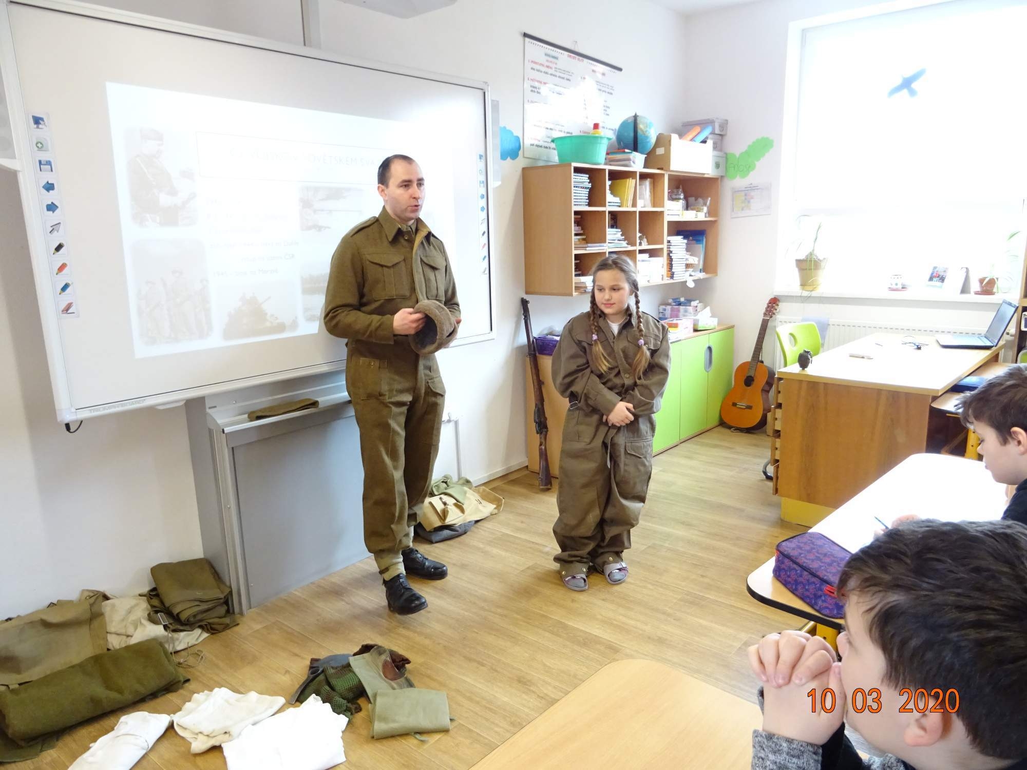I přes svůj věk děti prokázali dobré znalosti základních údajů o druhé světové válce. O to snadnější pak bylo povídání o vývoji československé armády od první světové války přes období první a druhé republiky k nacistické okupaci Čech a Moravy. Následně došlo na hlavní téma, kterým byl československý odboj během druhé světové války. Představen byl jak odboj domácí – včetně vlastenců pracujících pro odboj přímo v Tymákově – tak odboj zahraniční. Hlavní povídání se věnovalo československým jednotkám působícím na Středním Východě, ve Velké Británii a v Sovětském svazu, jejichž vybavení, výstroj i výzbroj, si žáci mohli zblízka prohlédnout a dokonce osobně vyzkoušet. Postupně se tak několik žaček a žáků proměnilo do podoby československých vojáků od Tobruku, od Dunkerque či od Sokolova a Dukly, byť v nepadnoucích stejnokrojích.