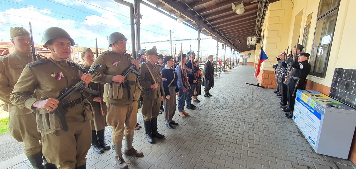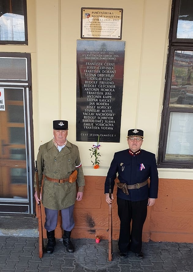 Další zastávkou bylo naše okresní město Nymburk. Zde jsme nejprve položili kytici u pamětní desky na zdejším nádraží. Deska připomíná zdejší železničáře, kteří zahynuli v průběhu války, ale především na jejím konci. Právě z jejich řad bylo již 2. května zažehnuto povstání ve zdejším regionu zastavením práce ve zdejších železničních dílnách a odzbrojováním okupantů.